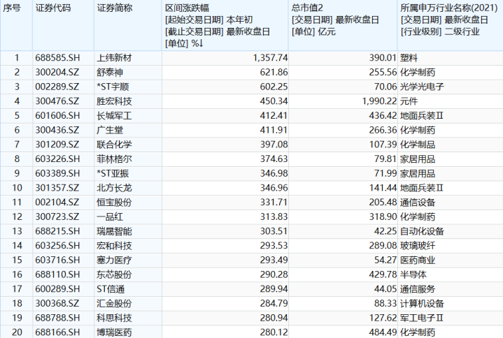 以涨幅前20的个股为统计样本,其行业分布相对更集中,其中生物医药5只,电子与国防军工各3只,基础化工、轻工制造和通信各2只。若拉长时间线看,部分高景气度行业的龙头个股,其在创下阶段新高后持续上涨的幅度令投资者惊叹。